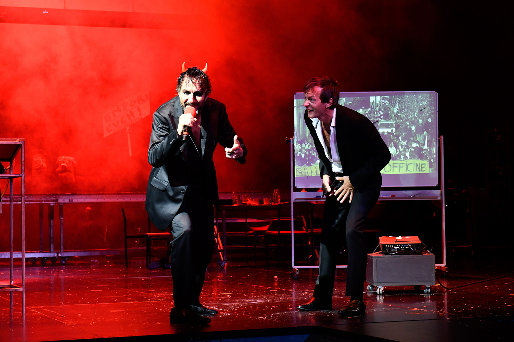 Dieser Faust ist weit gereist. Die Inszenierung zählt zu den wichtigsten Arbeiten der beiden Intendanten und wurde 2012 zum Berliner Theatertreffen eingeladen. Theater Heute wählt sie zur Inszenierung des Jahres, Benjamin von Blomberg wird als Dramaturg des Jahres ausgezeichnet und das neue Ensemblemitglied Sebastian Rudolph als Schauspieler des Jahres. In der Begründung der Jury für den 3sat-Preis des Theatertreffens steht: «So wie Nicolas Stemann Faust Ⅰ & Ⅱ inszeniert, hat man ihn noch nicht gesehen. Seine Inszenierung ist selbst ein faustisches Ereignis, ein Grübeln und Ergründen, was dieses Drama im Innersten zusammenhält, was es bereithält – für uns heute.» Dass Faust heute als Zeitgenosse anmutet, ist verstörend, aber es ist die Gegenwart, von der Goethe erzählt: eine durchbefreite Gesellschaft von Radikalindividualist*innen, unfähig zu Gemeinschaft und Arbeit an kollektivem Sinn. Und der Teufel flüstert in die Ohren: Sei dein eigener Massstab! Statt Erkenntnis gibt es Machtgewinn: Frauen, Natur und Kolonien werden gleichermaßen unterworfen und zerstört – die Zerrissenheit in der Brust dient dabei als Antrieb und Ausrede gleichermaßen.
