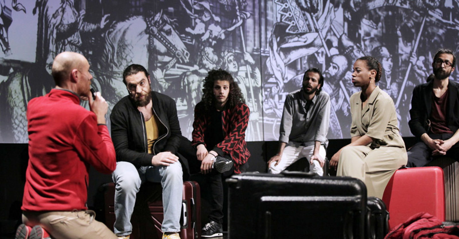 January 2017. The Exil Ensemble, newly established at the Maxim Gorki Theater in Berlin, consists of professional actors and actresses from Afghanistan, Syria and Palestine who have recently moved to the German capital. The group embarks on a two-week, winter coach tour of Germany with a foray into Switzerland. What is Germany or Switzerland? Niels, a German colleague, decides to show them aspects of Germany and Switzerland which demonstrate that these countries are capable of – and are more than – Hitler, dirndls and the Alps. What is Ayham Majid Agha, Maryam Abu Khaled, Hussein Al Shatheli, Karim Daoud, Mazen Aljubbeh, Kenda Hmeidan and Yael Ronen’s view of these countries of exile? How do they perceive coexistence with the natives, with the experts who attempt to explain Germany and Switzerland to them, and with the coach-driver? What mutual attempts at rapprochement are there, and how do they gauge these relationships? Israeli director Yael Ronen has already directed a guest performance at the Pfauen – “Common Ground” in 2015.